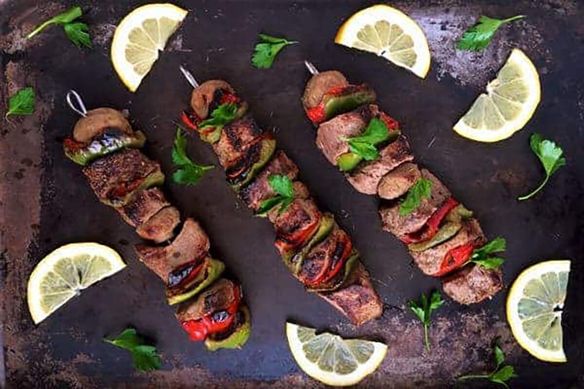 Kreikkalaiset lihavartaat (4 henkilöä) 1kg porsaan kasleria 5dl oliiviöljyä 3 valkosipulinkynttä 1,5tl suolaa 1rkl sokeria 1/2-1tl mustapippuria Marinadi: (jota sivellään